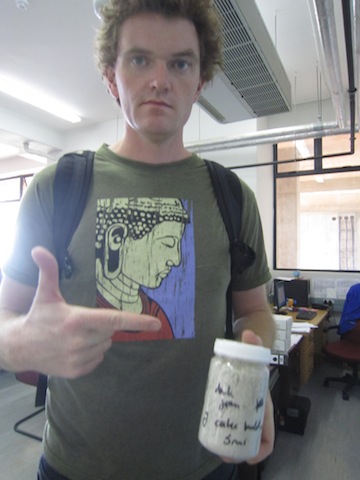 [caption id="attachment_1684" align="alignright" width="288" caption="Anthony geeks out over Struvite in a jar - super phosphorous!"]