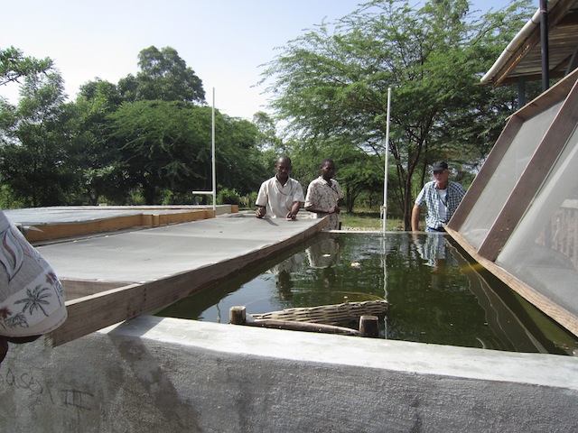[caption id="attachment_2299" align="aligncenter" width="300" caption="Theo and Agronom Romel show off the fish ponds"]