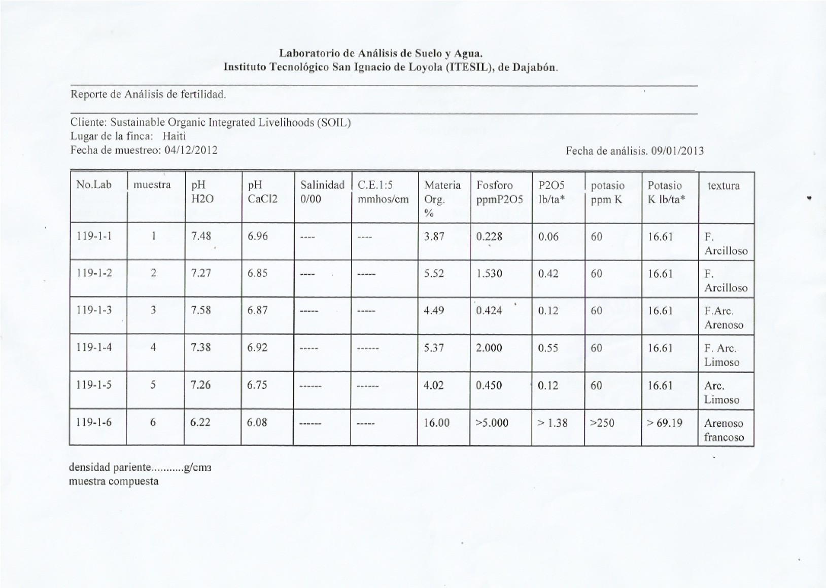 With help from our friends at the Instituto Tecnológico San Ignacio de Loyola (ITESIL) in the Dominican Republic, we are now able to look at our farm’s soils in quantifiable terms nutrient-wise! We were even able to compare the soil results to a SOIL compost sample and found that organic matter, phosphorus, and potassium are all significantly higher in the compost. This illuminates the possibilities of how compost applications could help ameliorate nutrient deficiencies in Haitian soils. If you’re curious, take a look at the printout below. These results not only give us a better idea of our land conditions specific to the area, they are being used by our agricultural intern as part of his research project on the effects of compost and urine on crops. Stay tuned for those results in the next few months!