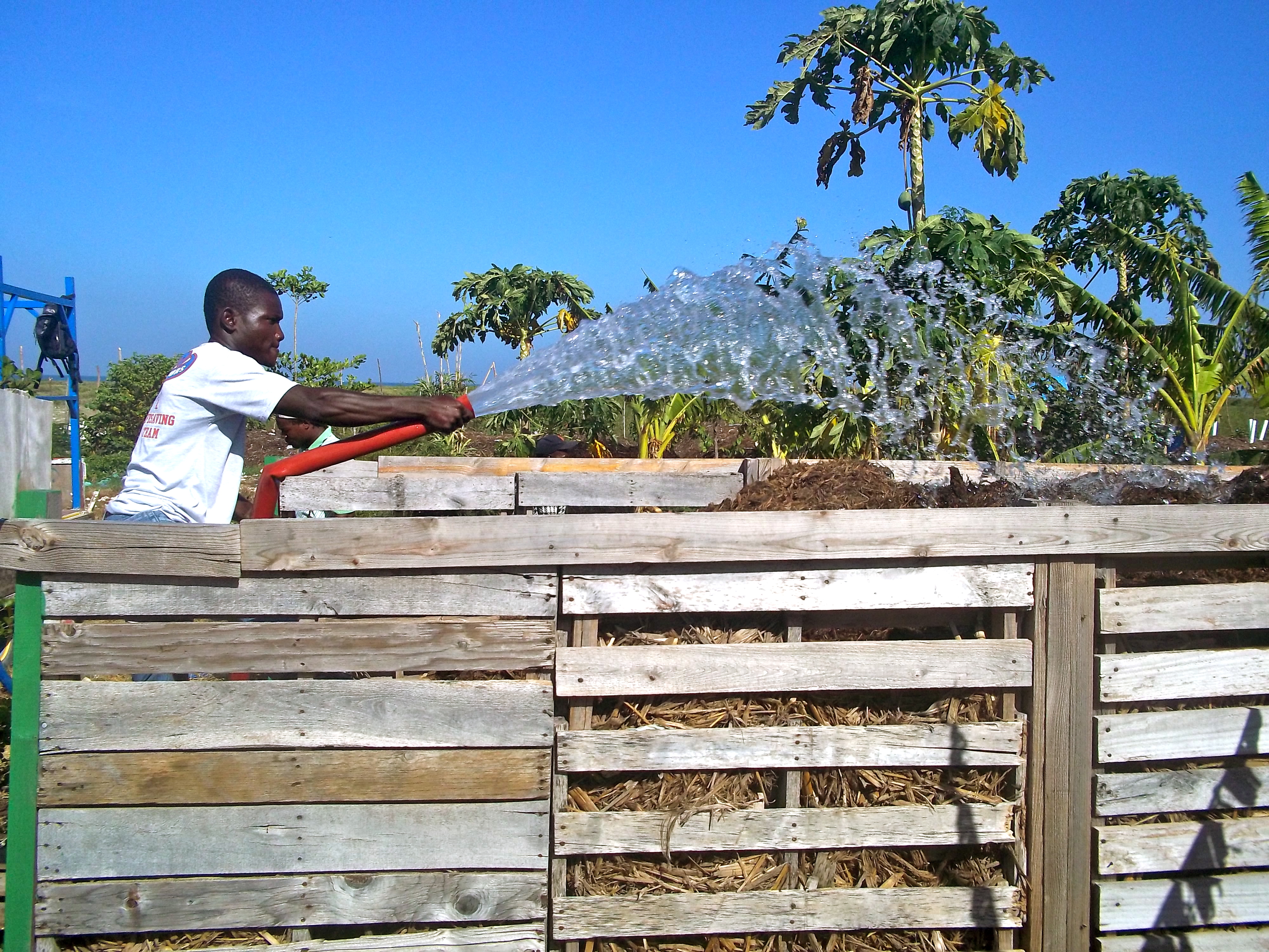 Gasper waters a bin full of compost at the Troutier composting site in Port-au-Prince[/caption]