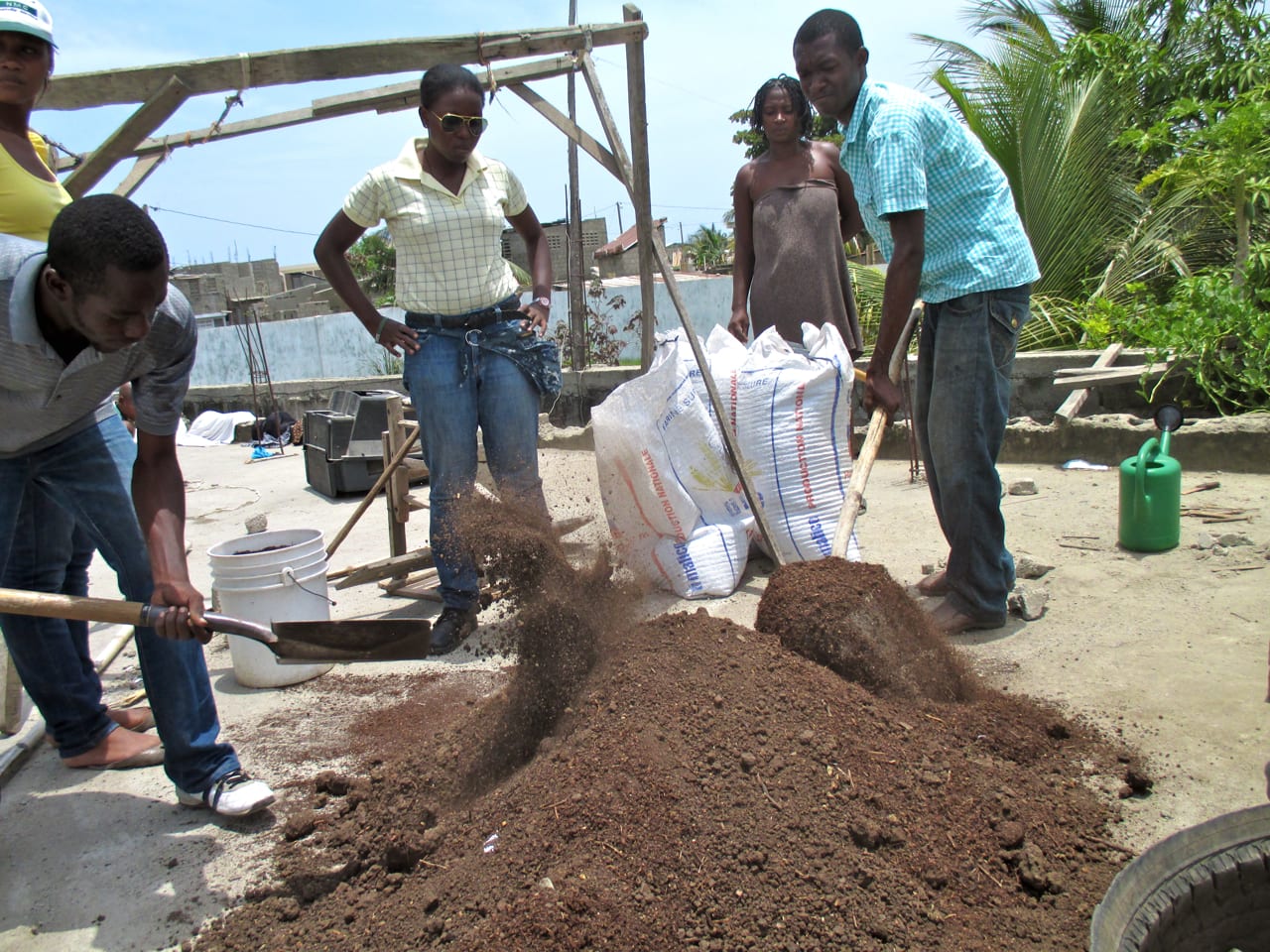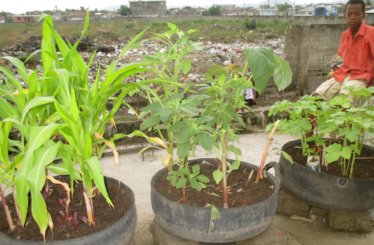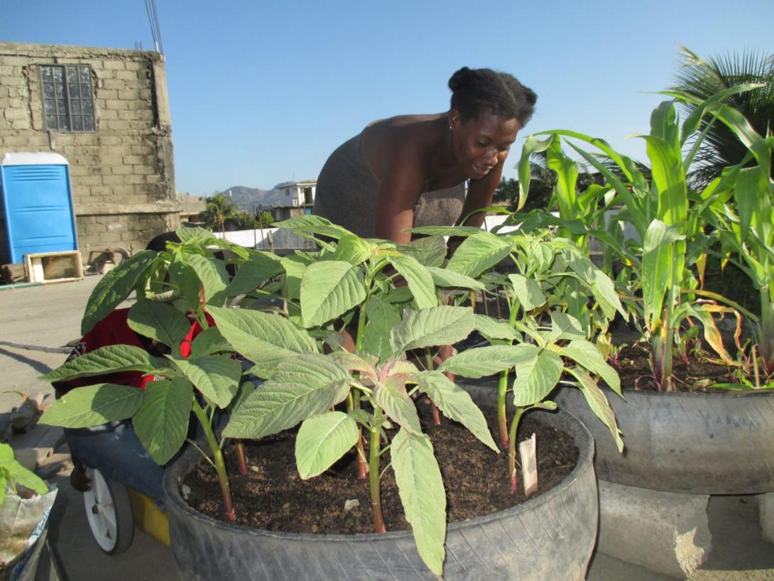 You may have seen some photos around our social media sites recently highlighting our urban household garden project, known as “Jaden Kay” in Haitian Creole. In this program, SOIL provides working examples, resources, and research to demonstrate how even people in the most dense neighborhoods can utilize locally made compost to create a garden, even if they only have space for a couple of buckets or tires. For less than 10 USD, families can start a garden that will produce an abundance of vegetables like spinach, tomatoes, and corn. SOIL helps gardeners to know the optimal amount of compost to use to get the highest yield.