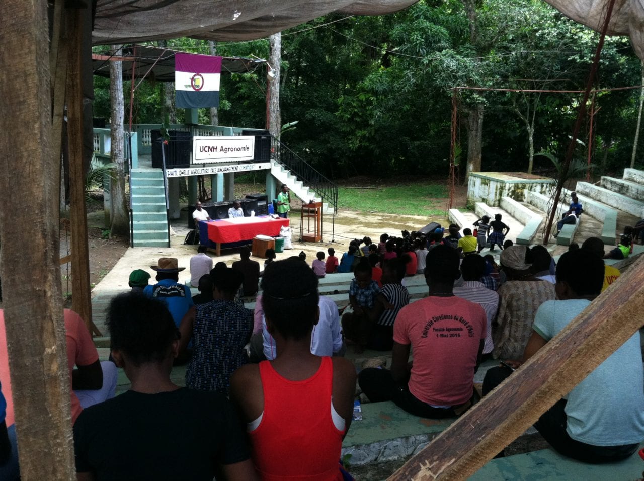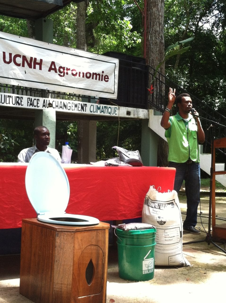 Sanitation Director Emmanuel Antoine talks about SOIL's work to address agriculture and sanitation issues in Haiti[/caption] May Day, or Agriculture and Labor Day here in Haiti, is celebrated as a national public holiday. One may wonder about the state of agricultural production here in Haiti after many decades of deforestation and environmental degradation. What is there to celebrate when Haiti is losing over 30 million metric tons of top soil every year and has to import the majority of its food? Haiti used to be known as the “Pearl of the Antilles,” producing so much that it exported the majority of its food. At SOIL, we believe that it’s important to celebrate all the work that local communities are doing to improve agriculture systems and support the dream of reaching agricultural abundance once again. Every tree that is planted, every student who earns an agronomy degree, every field restored with healthy soil, and every person who learns more about SOIL’s work and composting is a reason to celebrate. We took all of our reasons to celebrate, along with a toilet model, bag of compost, and a few SOIL staff members to the annual May Day festival at the Université Chrétienne du Nord d’Haïti (UNCH) in Limbé. We presented our work on stage in front of a large audience of interested onlookers. Emmanuel Antoine, our Sanitation Director, gave a compelling speech about how Ecological Sanitation connects sanitation to agricultural systems and environmental health.