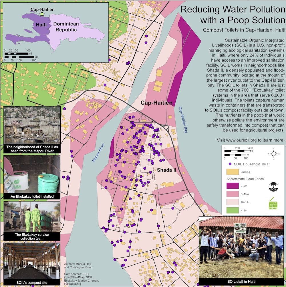 Hot off the press is Guerilla Cartography’s Water Atlas, their latest project featuring volunteer submissions of maps on all things water, including one titled “Reducing Water Pollution with a Poop Solution” – a map on SOIL’s EkoLakay household sanitation service!