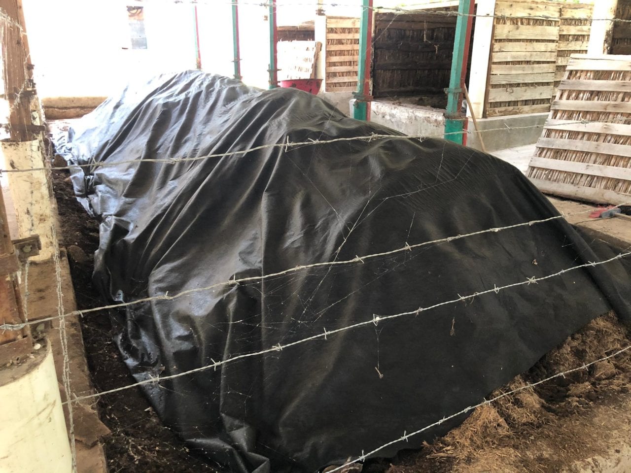Windrow test pile at SOIL’s composting facility, covered with geofabric in order to maintain temperature and moisture, and limit vector contamination.