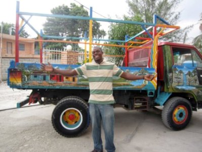 Several times a week SOIL driver Clotes Alexandre starts up the large flatbed truck parked outside the front door of the office and rumbles out into the streets of Port-au-Prince. With the help of SOIL's Drum Collection Team, Davidson Ulysses and Herby Sanon, Clotes works his way through urban neighborhoods and tent cities, collecting the 15 gallon drums used in SOIL's ecological toilets and driving them out to a SOIL composting site where the drums are then dumped and cleaned and readied for redistribution on the next trip. Thanks to a donation from the Rattray Kimura Foundation, SOIL recently transformed this truck, aka "The Poopmobile" into a vibrant celebration of environmental awareness. The back of the truck now reads "Pwoteje anviwonman an se pwoteje tet ou" / "Protect the environment and you are protecting yourself" and "Chanjman tout bon an komanse nan mwen avan" / "Change begins with me". [caption id="attachment_1326" align="aligncenter" width="399" caption="The SOIL Poopmobile in the early days."]