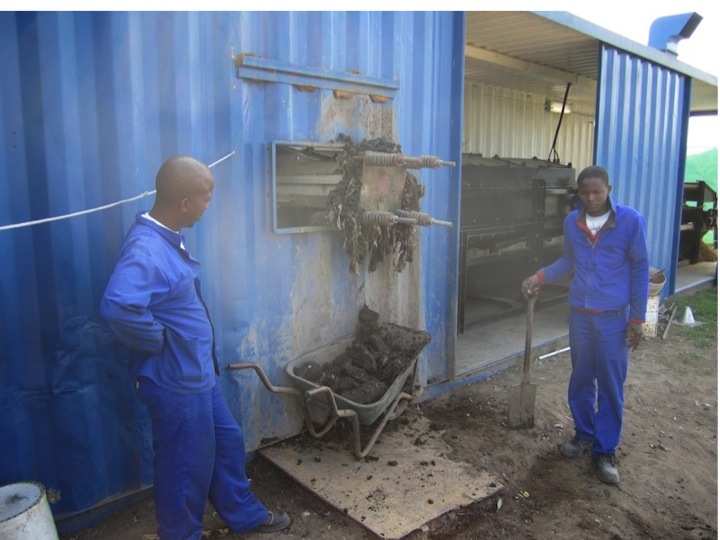 The poop pelletizer is a patented technology which bakes solid latrine sludge under very high temperatures. The sludge is loaded into the pelletizer using a bobcat…