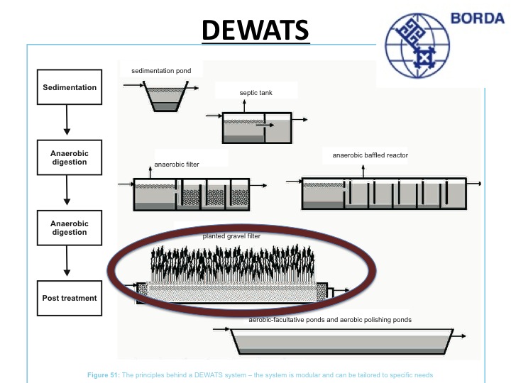 DEWATS means decentralised wastewater treatment system. It is more of an approach than a technology, and it can apply to wastewater and compost. The slide shows an example of a DEWATS system. There are 2 concepts to focus on. 1) The treatment system is modular, because treatment of wastewater usually requires different intensities of treatment 2) Post-treatment is essential if effluent release is in an urban area, like Port-au-Prince.