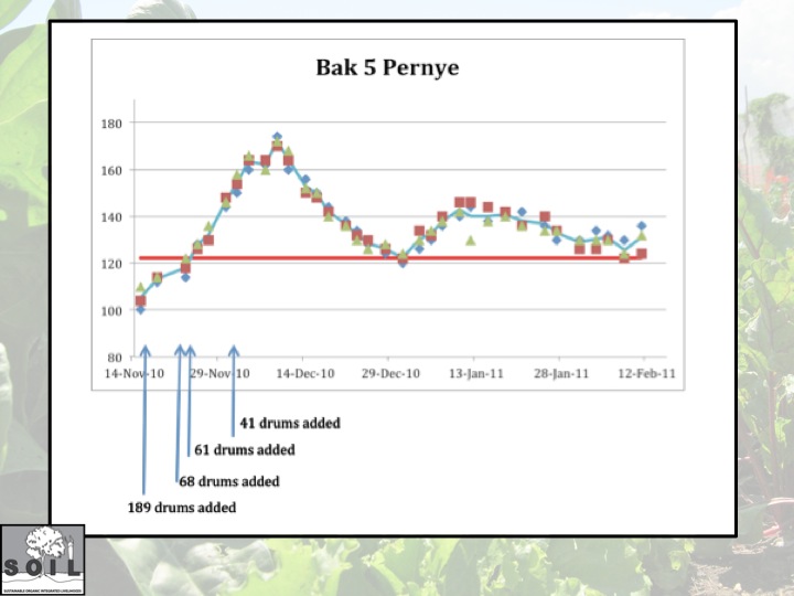 Nan sit konpostaj SOIL la nou kite konpos nan bak yo pou omwen 3 mwa epi pandan peryod sa nou pran tanperati yo chak 2-3 jou. Le tanperati a komanse desan nou deplase konpos la pou mete l nan pil pou li ka fin dekonpoze.