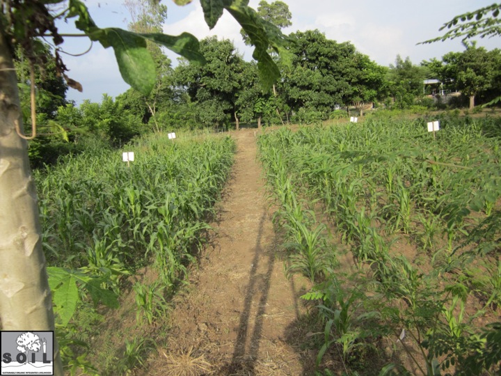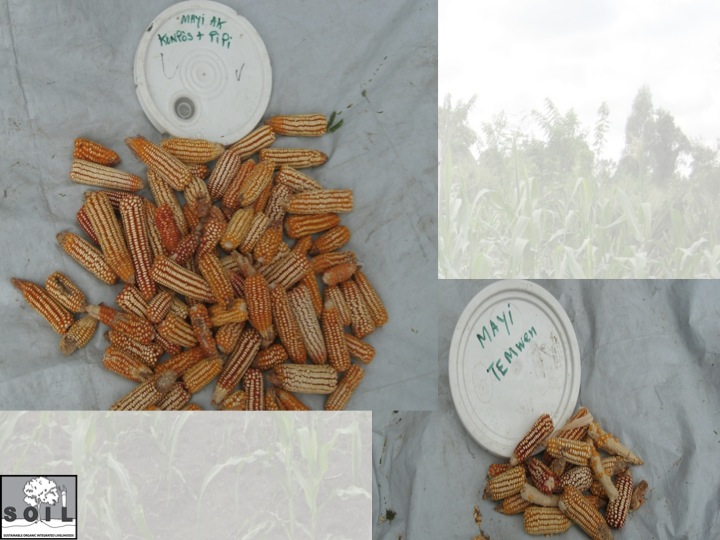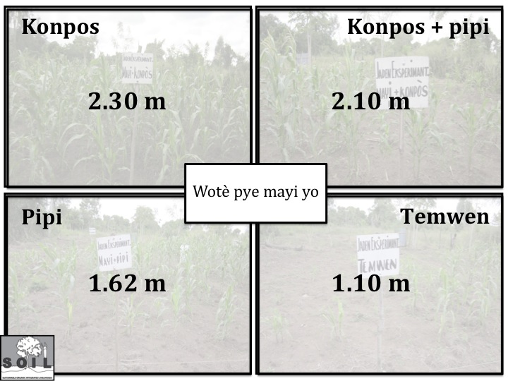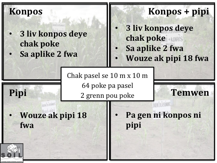 Men yon egzamp yon eksperyans SOIL te fè nan jaden Okap la. Nou te mete kanpe 4 pasèl eksperimantasyon ki gen dimansyon 10m x 10m konsa yon pasèl ap realize ak mayi ak konpòs, yon lòt ak mayi ak pipi, yon lòt ankò ak mayi ak konpòs ak pipi, yon lòt ankò ap sèvi pou pasèl temwen (pasèl sa pap gen konpòs, pap gen pipi)