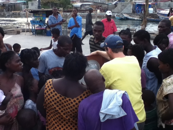 [caption id="attachment_2315" align="aligncenter" width="584" caption="Sebastien shows a client (and the crowd) the features of her new toilet. We usually do this in each family’s home, but she came to us with a wheelbarrow before we even had time to visit her house!"]