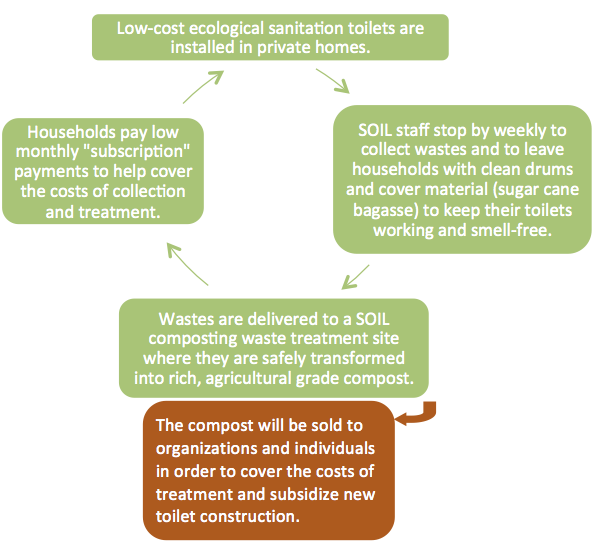 SOIL believes that compost sales and user fees collected from households wanting an ecological sanitation (EcoSan) toilet can cover the ongoing maintenance, collection and treatment costs of providing household sanitation services. To test this hypothesis, SOIL and our partners plan to build household toilets in the Cap-Haitien neighborhood of Shada. We have established a biweekly collection system and the wastes collected will be treated at SOIL’s composting waste treatment site in Limonade. The compost generated will be sold to help subsidize the household toilet project and cover the ongoing costs of waste treatment. Small monthly user fees will be collected from participating households to ensure buy‐in among participants, and to demonstrate a healthy revenue stream that can inspire and attract small businesses in Haiti. We hope this project will provide a point of entry for small Haitian businesses to begin participating in the service delivery system and/or implementing similar projects of their own – thereby helping to increase sanitation access across Haiti, contributing to long-term job creation and building up a system that can continue long after international aid for Haiti has dried up.