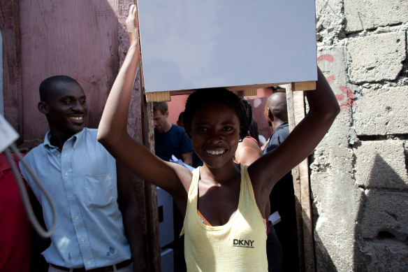 [caption id="attachment_2610" align="aligncenter" width="584" caption="Carrying a new SOIL household EcoSan toilet home in Shada, Cap-Haitien."]