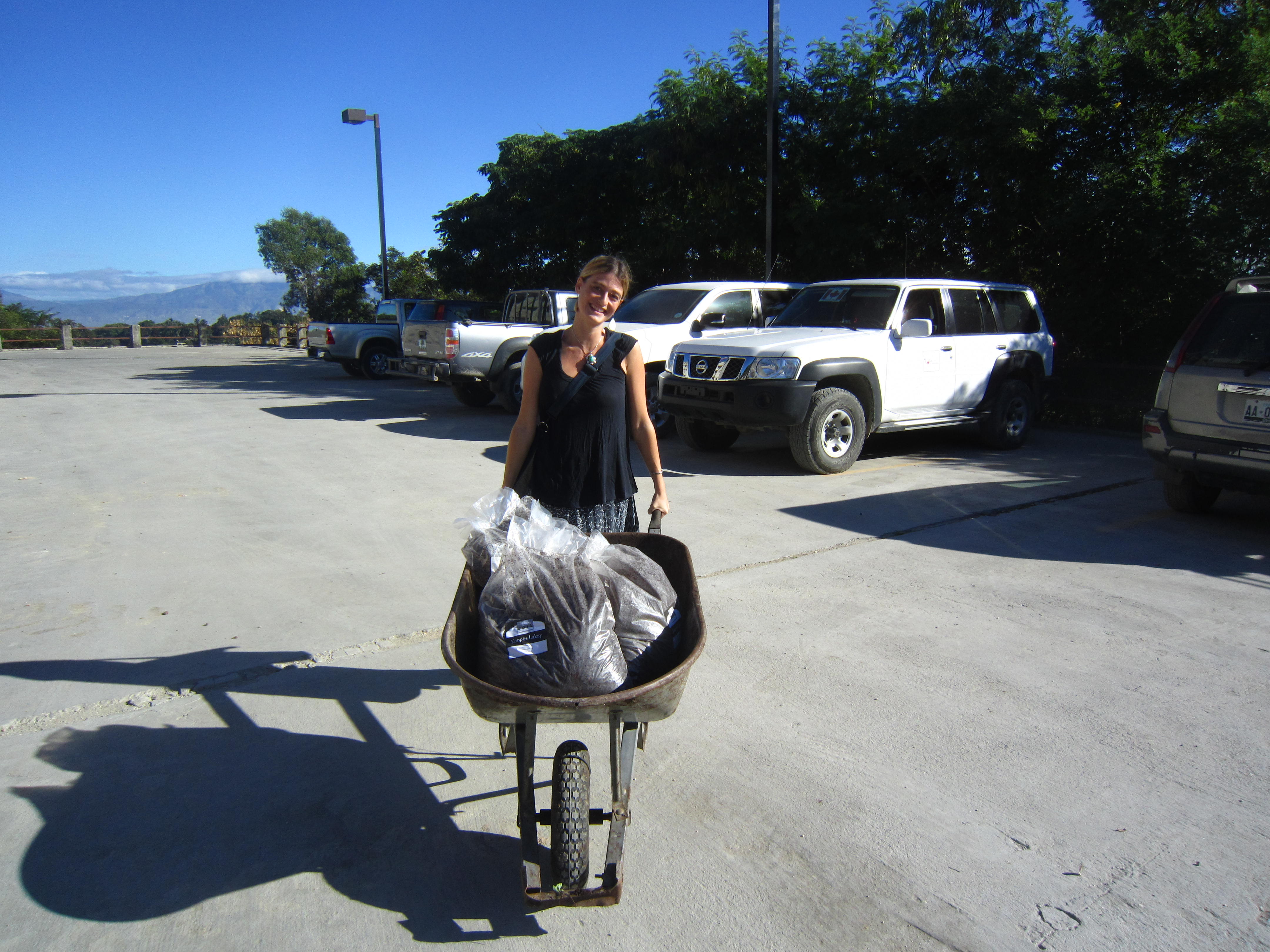 Sasha and I made a grand entrance into today's CGI (Clinton Global Initiative) meeting, hosted at the Karibe Hotel in Port-au-Prince. As some of you may know, both the Karibe and CGI meetings in general are pretty fancy, but that didn't stop the SOIL crew from wheeling in a giant squeaky wheelbarrow full of beautiful compost! And the best part? Everyone loved it! Sasha introduced our Christmas Compost Special--we are selling 1,200 bags of compost for the holiday season--and we even sold the 5 bags that we had brought along for display. We were deeply flattered and very encouraged to see so much interest in our compost, and we were pretty tickled to wheel it through the hotel lobby, too!