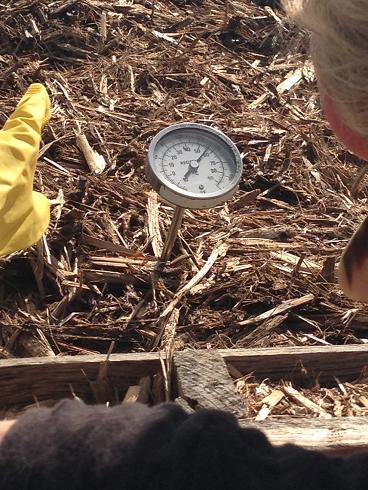 SOIL’s Sasha Kramer reads a thermometer stuck in a large pile of fecal waste at the composting site. The temperature must remain above 50 degrees Celsius for seven days to kill off the cholera bacteria."