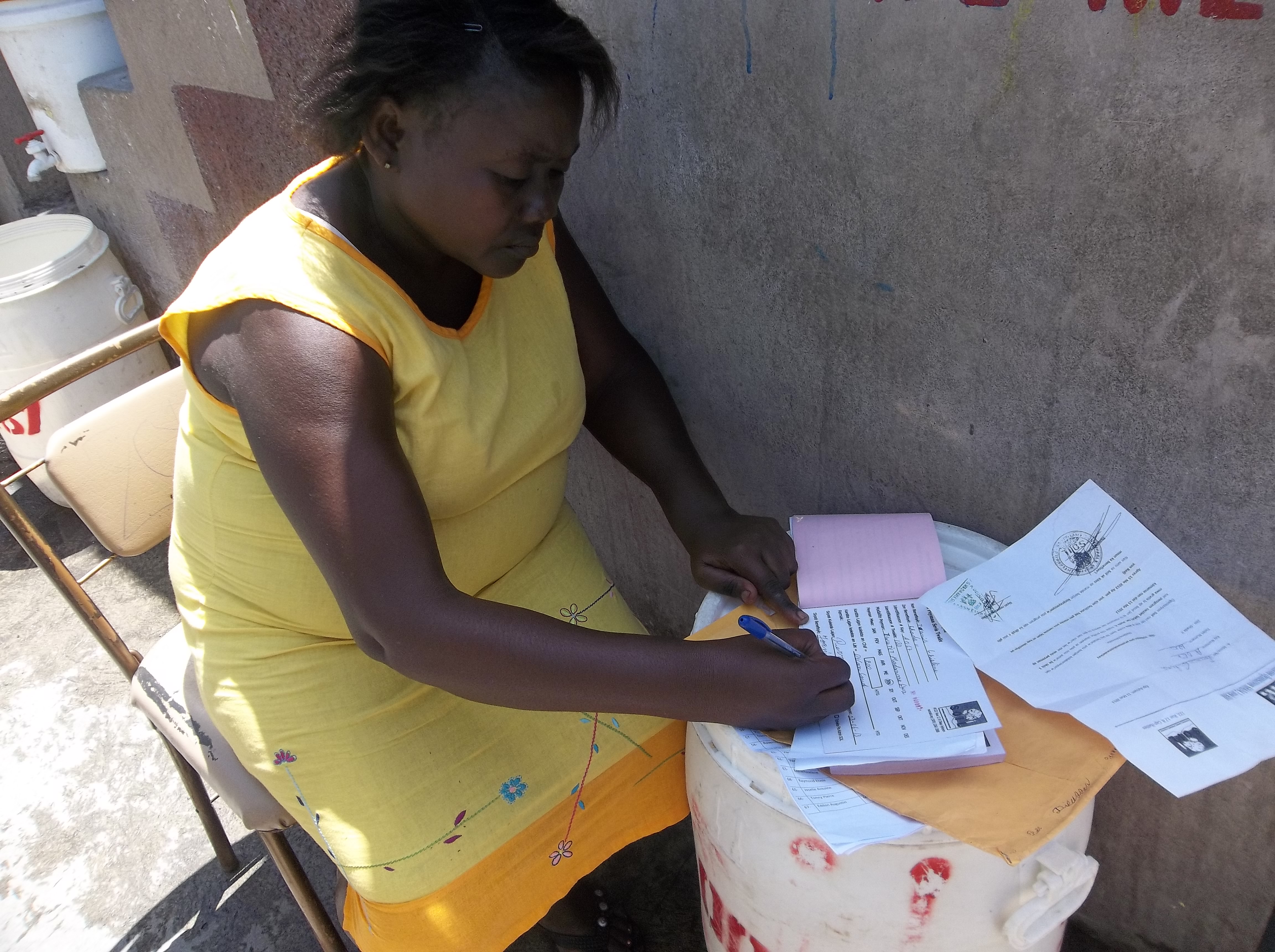A SOIL customer signs her receipt after paying her family's monthly fee.[/caption]